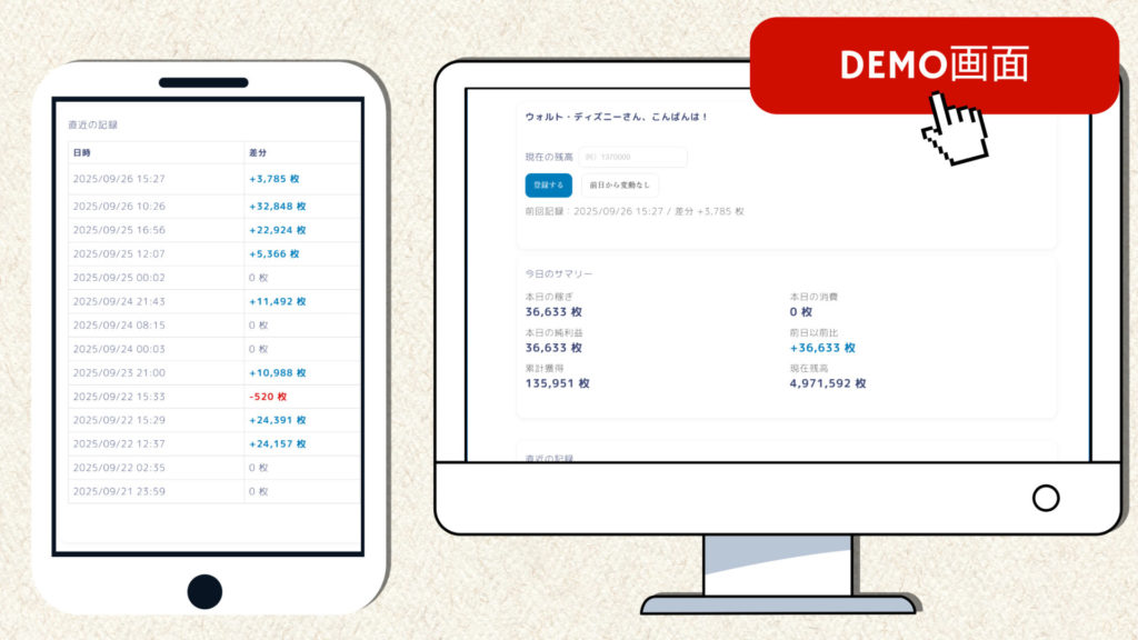 ツムツム家計簿では 日々のコイン稼ぎを管理し、「今日はどれだけ稼いだ?」「今月の稼いだコイン数は?」「昨日はガチャに使い過ぎたかな??」などコインに関する収支を分かりやすく管理します。